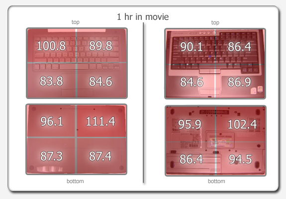 Although not the most CPU intensive test in the world, I thought it was much closer to the average use of a laptop. So each laptop was to play the movie without interruption while running from battery power. I would check the temperature of four zones on both the top-side and bottom-side of the laptops. I would record the temperatures upon the successful start up of the operating system, after one hour of playtime, and at the end of the movie (1 hour 45 min).